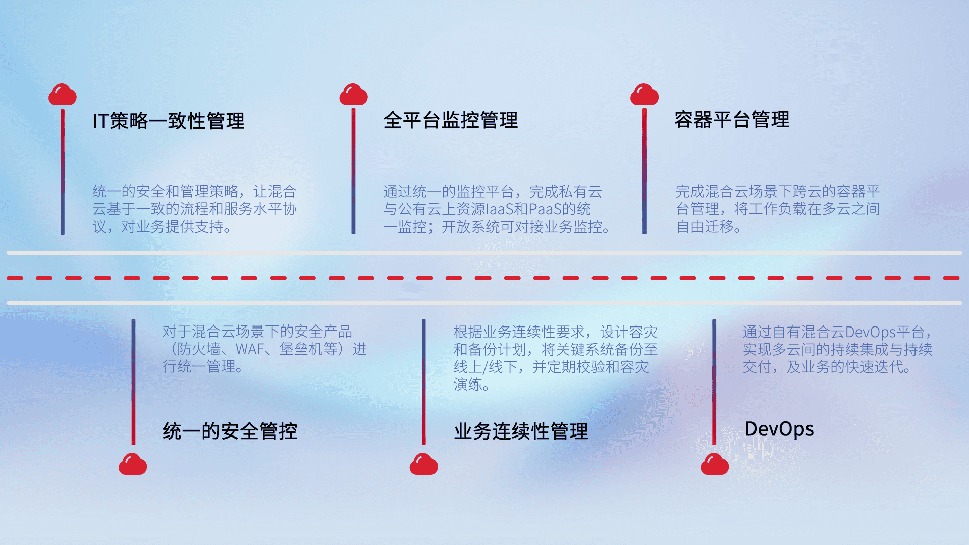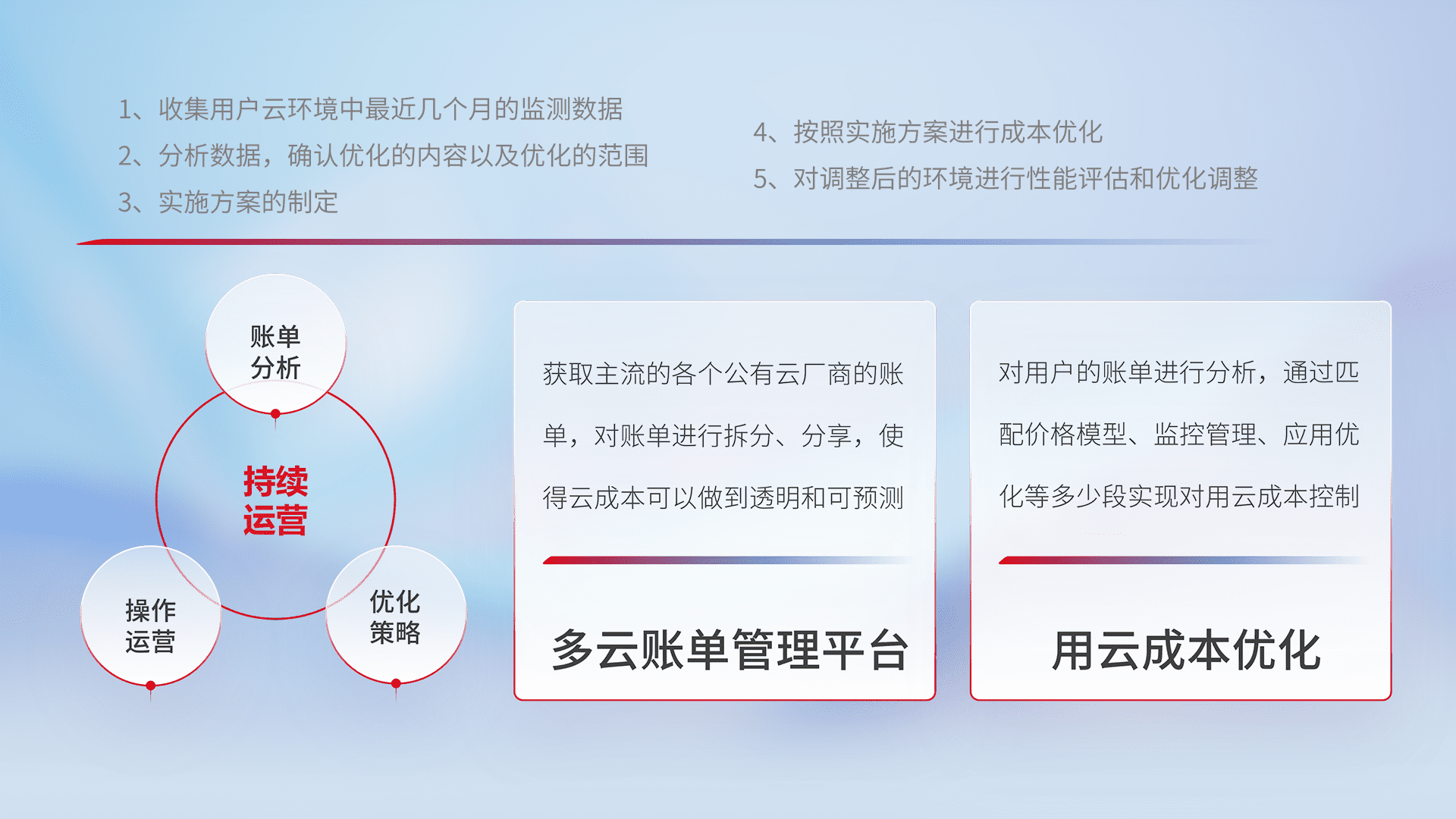 通过多云纳管,,以统一的资源数据模型把客户的云资源进行抽象和封装,,,进而实现对多云资源的统一操作,,,保障云资源管理的可靠性、、稳定性与可用性。。。。量身定制化运维内容,,,,配置、、开发运维、、、、补丁管理、、、备份、、、、监控、、认证和访问管理、、审计和日常巡检等,,,保障在用云过程中的可靠度,,,稳定度以及高可用率。。。。